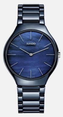 A minimalist and ultra-thin ceramic timepiece, the Rado Thinline combines sleek design, lightweight comfort, and scratch-resistant durability, epitomizing elegance for modern wearers.