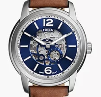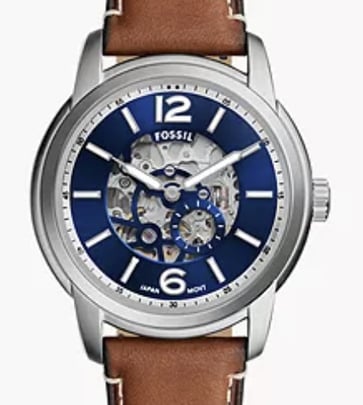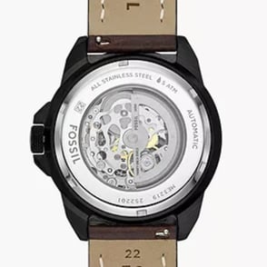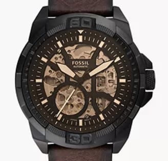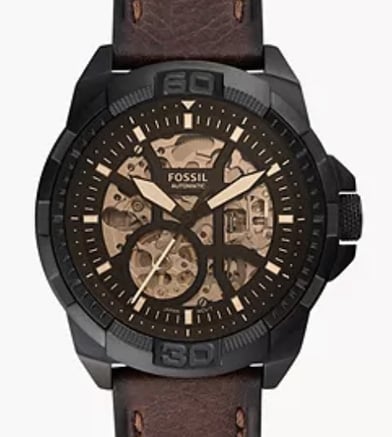 "Fossil Bronson Automatic ME3219 features a bold design with a brown LiteHide™ leather strap, automatic movement, and transparent case back, offering a perfect blend of style and functionality."