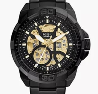 "Fossil Bronson Automatic ME3217 is a bold black stainless-steel watch featuring automatic movement, a transparent case back, and a striking industrial design, perfect for style-forward and mechanically inclined watch enthusiasts."