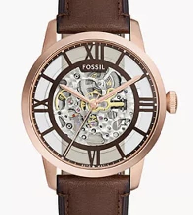 "Fossil Townsman Automatic ME3259 is a classic timepiece featuring a brown leather strap, automatic movement, skeleton dial, and timeless design, perfect for those who appreciate vintage-inspired elegance."