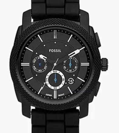 "Fossil Machine Chronograph FS4487 is a rugged black silicone watch featuring a chronograph function, durable build, and bold design, perfect for casual wear and active lifestyles."