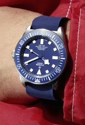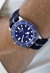 The matte blue dial, bidirectional bezel, and fixed strap bars reflect a professional-grade design tailored for underwater exploration while retaining a bold and modern aesthetic.