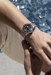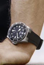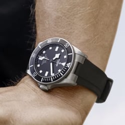 The watch's sleek titanium case and understated black dial make it ideal for casual and sporty ensembles. Its versatile design complements nautical-inspired and outdoor adventure attire.
