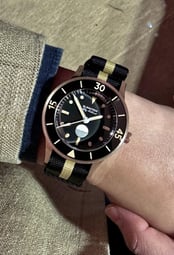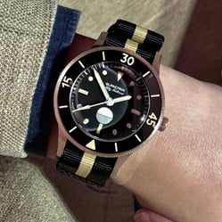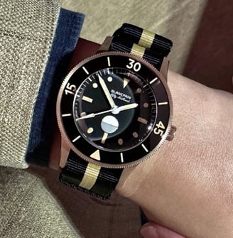 The watch's elegant bronze-gold case and black NATO strap make it versatile for both casual and semi-formal occasions. It complements outfits ranging from smart casual to nautical-inspired attire.